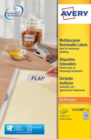 25 flle étiquettes enlevables Avery 189 x 25,4/10 mm