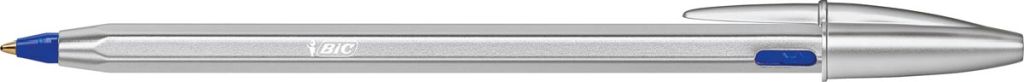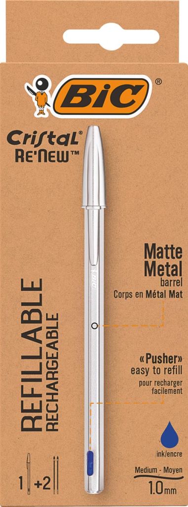 Bic stylo à bille Cristal Re-new, corps argent, encre bleu, boîte de 1 pièce et 2 recharges