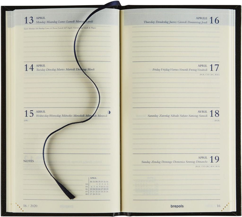 - 1 semaine sur 2 pages 6 langues Relié Papier crème de 60 g/m² Avec ruban marque-page et coins détachables Couverture en similicuir uni Ft 90 x 160 mm Certificat: FSC Mixte Lima, bleu