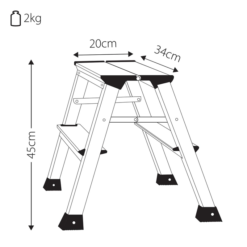 - En aluminium 2 marches Hauteur: 45 cm Capacité de charge : 150 kg Poids: 2,04 kg Avec roulettes, pendant l'utilisation immobilisé par le poids