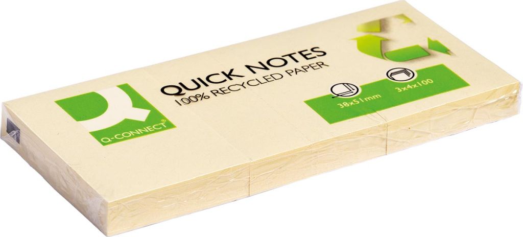 Q-CONNECT Quick Notes Recycled, ft 38 x 51 mm, 100 feuilles, paquet de 3 blocs, jaune