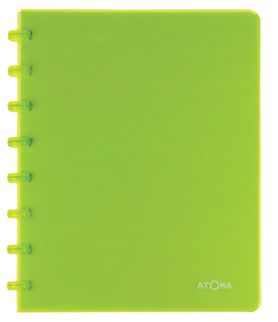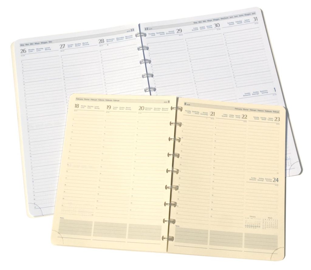 - 1 week per 2 pagina's 6-talig Crèmekleurig papier van 80 g/m² Met ringen ATOMA Kaft uit transparante PP in geassorteerde kleuren: rood, paars, lichtgroen, turkoois en blauw Keuze kleur niet mogelijk ft 210 x 297 mm (A4), 128 pagina's