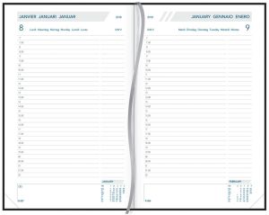 - 1 dag per pagina, ook zaterdag en zondag op aparte pagina's 6-talig Garenloos gebonden Wit papier van 70 g/m² 384 pagina's Met geperforeerde hoeken en leeslint Gewatteerde omslag Ft 140 x 210 mm Certificaat: FSC Florence, geassorteerde kleuren: bordeaux, groen, blauw en zwart