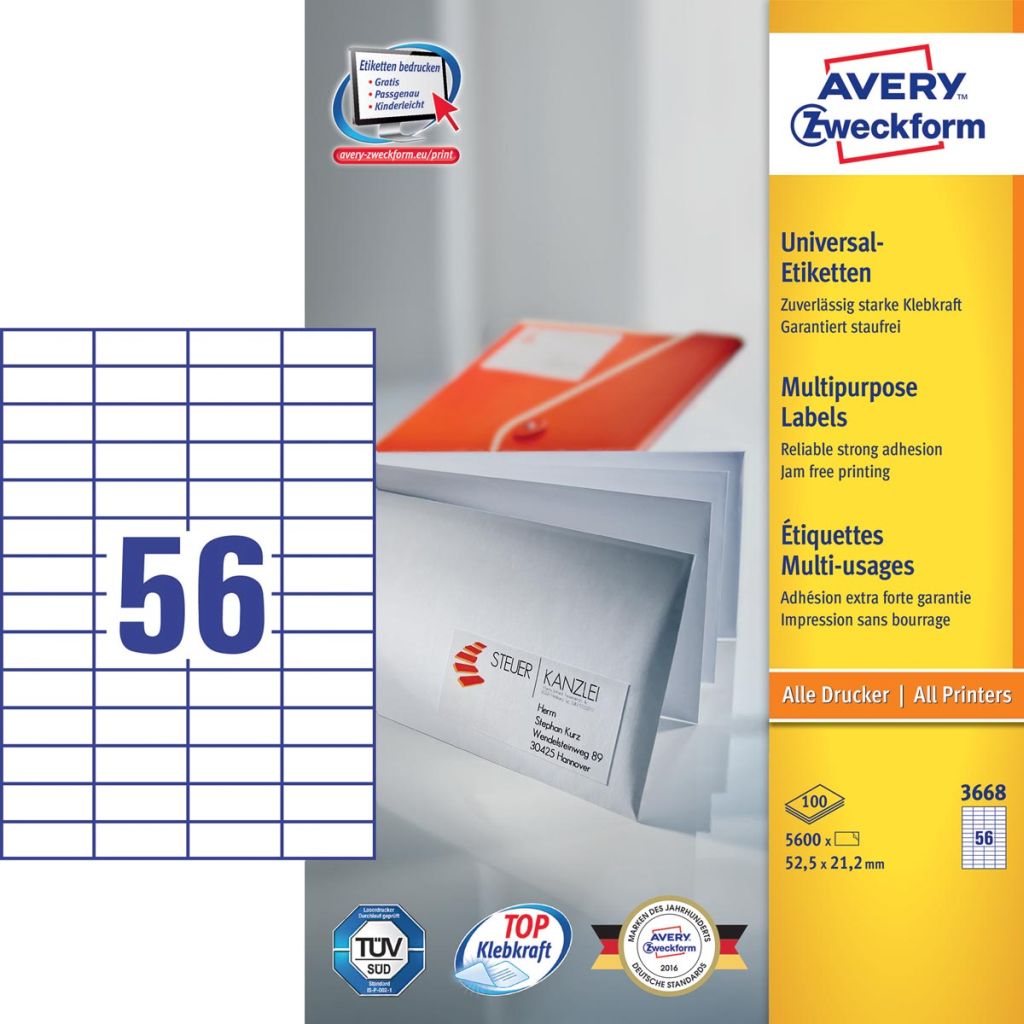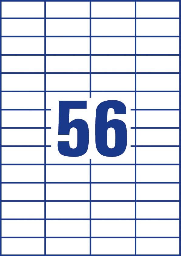 - Specificaties: Quickpeel: eenvoudig etiketten verwijderen van het blad Voor kopieermachines, laser- en inkjetprinters Met rechte hoeken Ft 21 x 29,7 cm (A4) FSC-gecertificeerd ft 52,5 x 21,2 mm, 5.600 stuks, 56 per vel, doos van 100 vel
