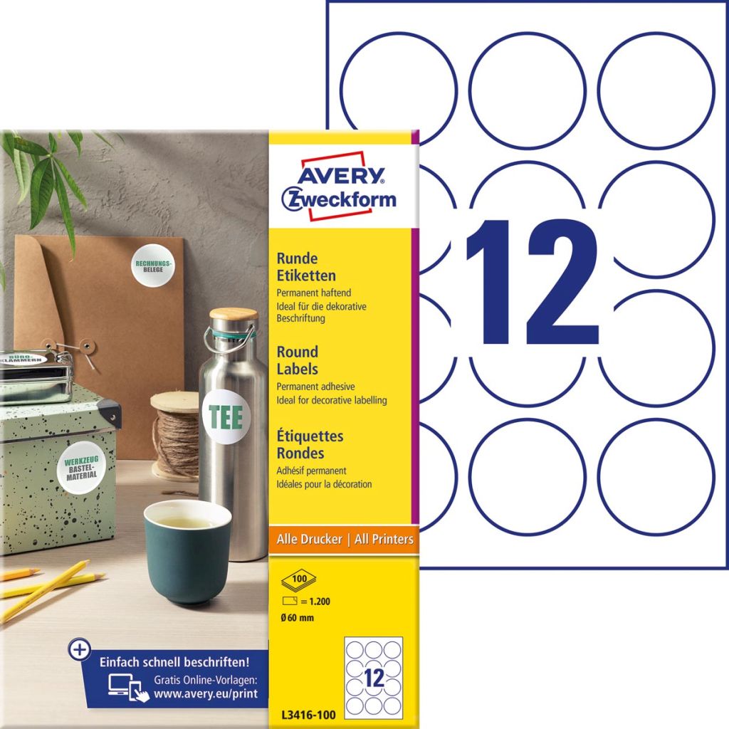 Avery Zweckform ronde etiketten, diameter 60 mm, wit, permanent klevend, 120 etiketten, 10 vellen