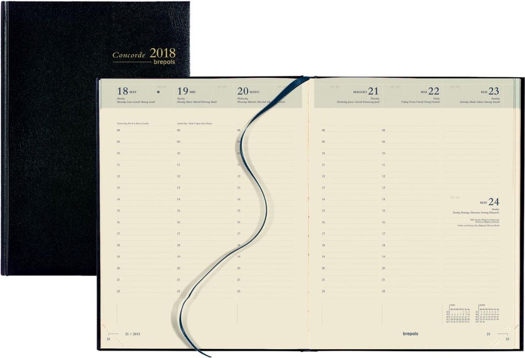- 1 week per 2 pagina's Uurindeling (8u - 22u) 6-talig Boekgebonden Crèmekleurig papier van 90 g/m² Met leeslint en scheurhoekjes Kaft uit effen kunstleder Ft 210 x 270 mm Certificaat: FSC Mix Lima, zwart