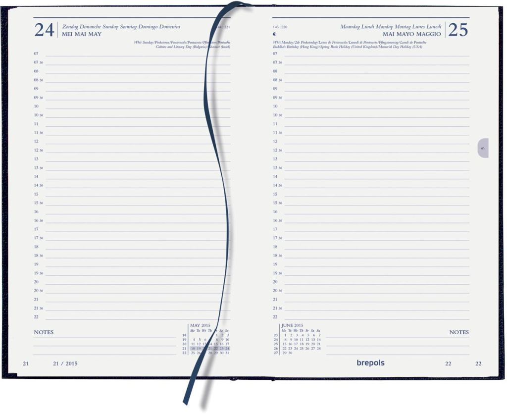 - 1 dag per pagina Halfuurindeling (7u - 22u) 4-talig Boekgebonden Wit houtvrij papier van 70 g/m² 384 pagina's Met leeslintje, scheurhoekjes en gedrukte tabs Kaft uit effen kunstleder Ft 133 x 208 mm Certificaat: FSC Mix Lima, kaft uit effen kunstleder, blauw