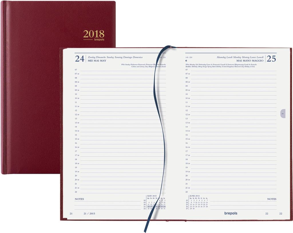 - 1 dag per pagina Halfuurindeling (7u - 22u) 4-talig Boekgebonden Wit houtvrij papier van 70 g/m² 384 pagina's Met leeslintje, scheurhoekjes en gedrukte tabs Kaft uit effen kunstleder Ft 133 x 208 mm Certificaat: FSC Mix Lima, kaft uit effen kunstleder, bordeaux
