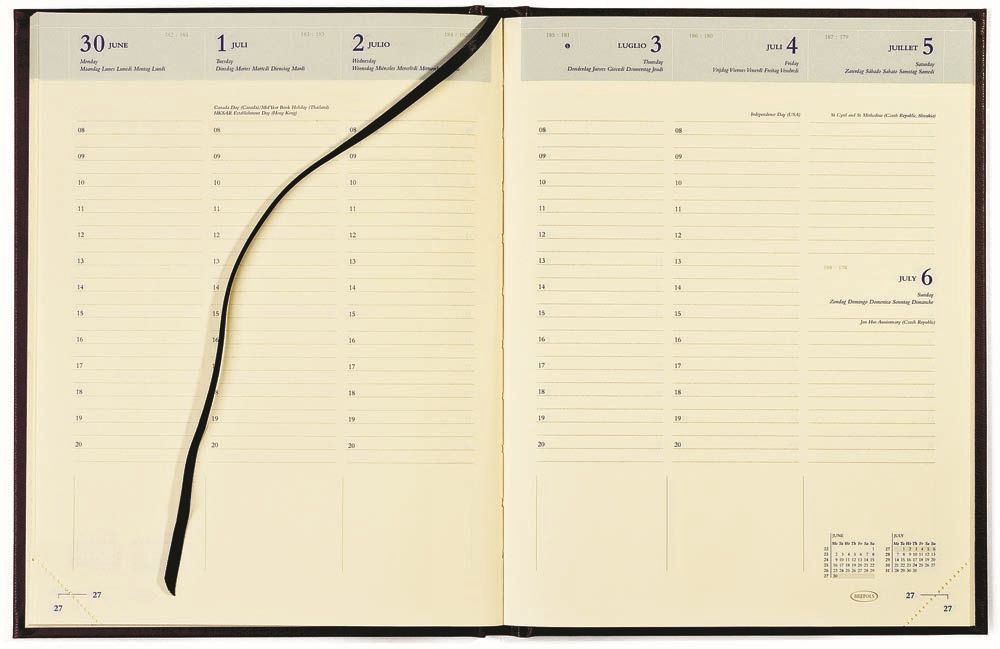 - 1 week per 2 pagina's Uurindeling (8u - 22u) 6-talig Boekgebonden Crèmekleurig papier van 70 g/m² Met leeslint en scheurhoekjes Kaft uit effen kunstleder Ft 171 x 220 mm Certificaat: FSC Mix Lima, zwart