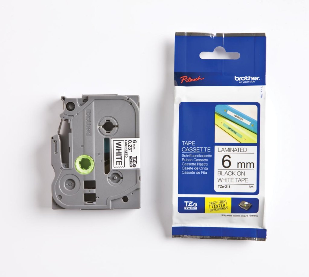 Reeks TZE gelamineerd. Voor PT-18R, PT-H101, PT-210, PT-220, PT-300, PT-310, PT-340(C), PT-350, PT-540(C), PT-550, PT-700, PT-1750, PT-1800(E), PT-1830VP, PT-1850/1850VP, PT-1950VP, PT-2030, PT-2400(E), PT-2420PC, PT-2450/2450DC, PT-2460, PT-2480, PT-2700, PT-3600, PT-9200PC, PT-9200DX, PT-9400, PT-9500PC, PT-9600. Linten tot 24 mm voor PT-350, PT-540(C), PT-550, PT-1000, PT-2400(E), PT-2420PC, PT-2450/2450DC, PT-2460, PT-2480, PT-3600, PT-9200PC, PT-9200DX, PT-9400, PT-9500PC, PT-9600. Linten tot 36 mm voor PT-550, PT-3600, PT-9200PC, PT-9200DX, PT-9400, PT-9500PC, PT-9600, PT-H75. 6 mm, zwart/wit