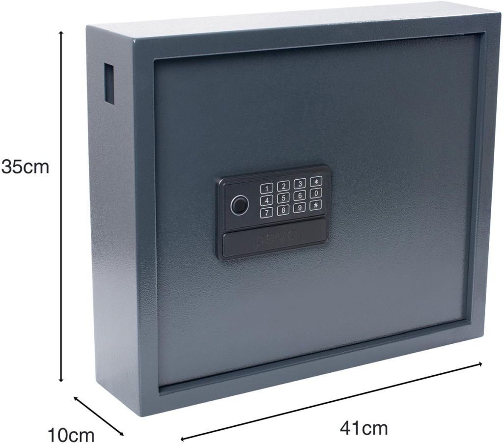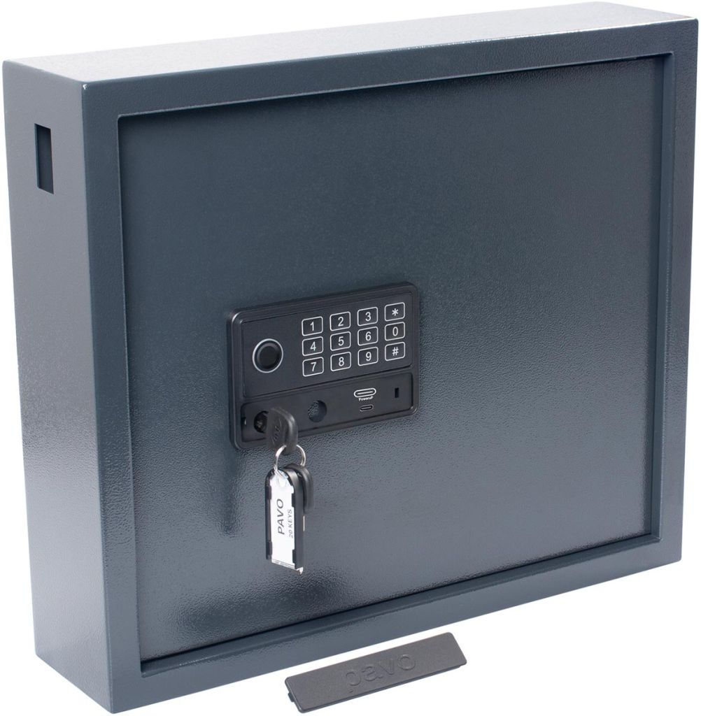- - elektronisch cijferslot (3 tot 8 cijfers) - noodsleutel voor handmatige toegang (2 sleutels meegeleverd) -vingerafdruk 10 sleutelhangers Magnettag meegeleverd Inclusief USB type-C connector voor externe voeding (noodstroomoplossing) Kleur: donkergrijs ft 35 x 41 x 10 cm, voor 20 sleutels