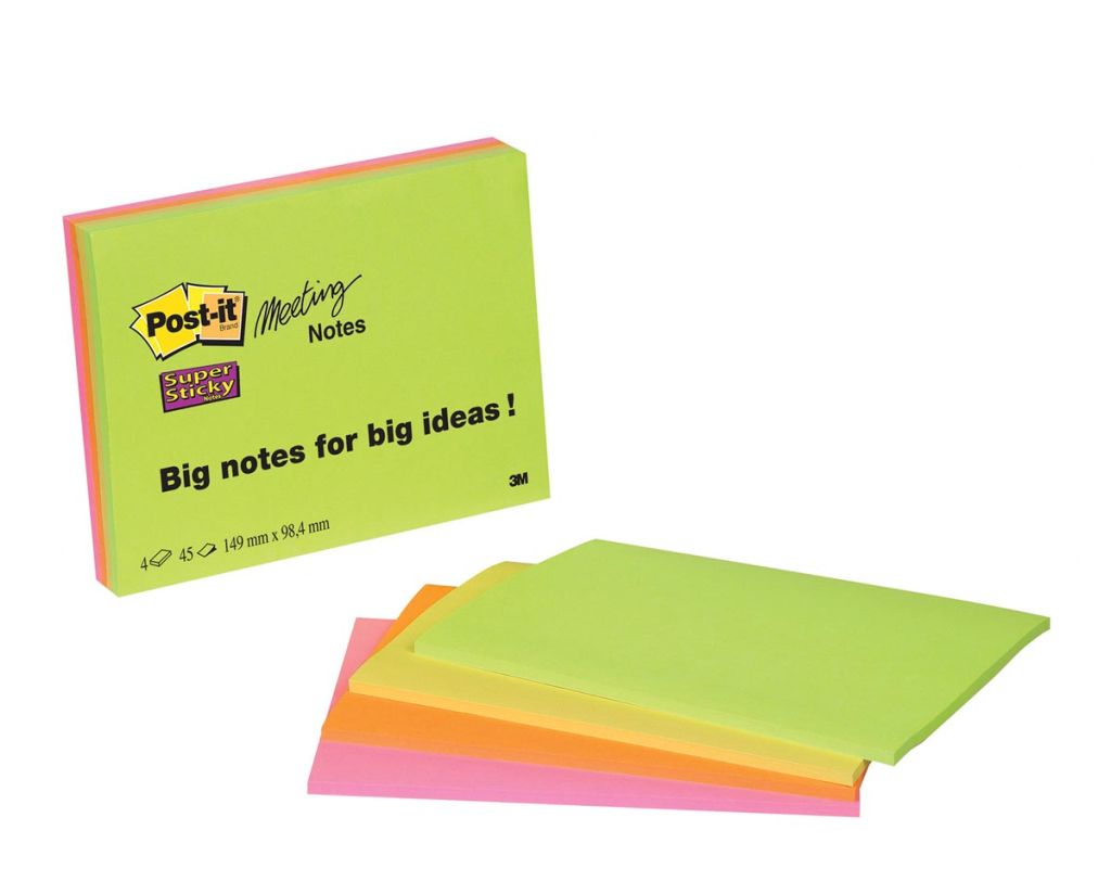 Post-It Super Sticky Meeting notes, 45 vel, ft 101 x 152 mm, geassorteerde kleuren, pak van 4 blokken
