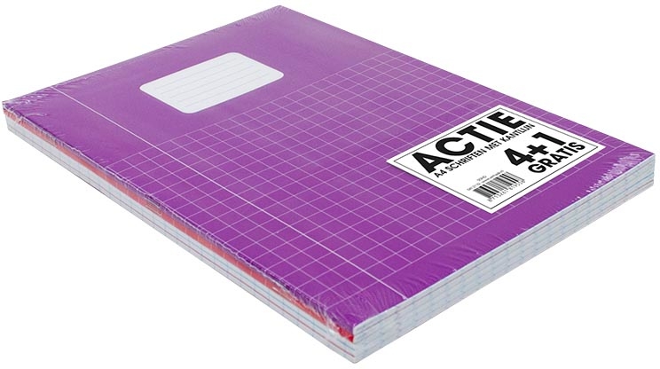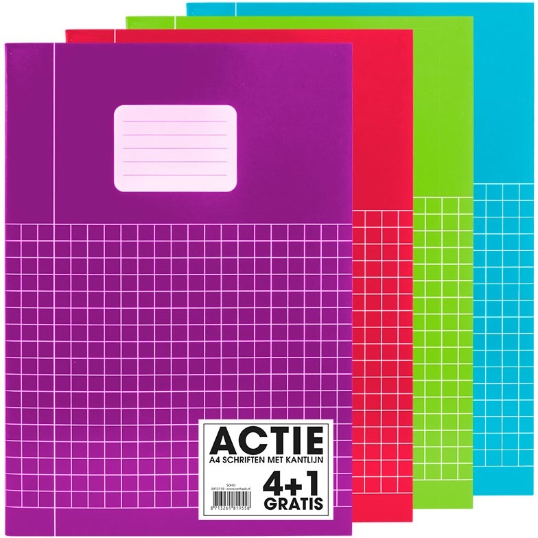 SOHO Trend schrift, A4, 40 vel, geruit 10 mm, met kantlijn, pak van 4 + 1 stuks, geassorteerde kleuren