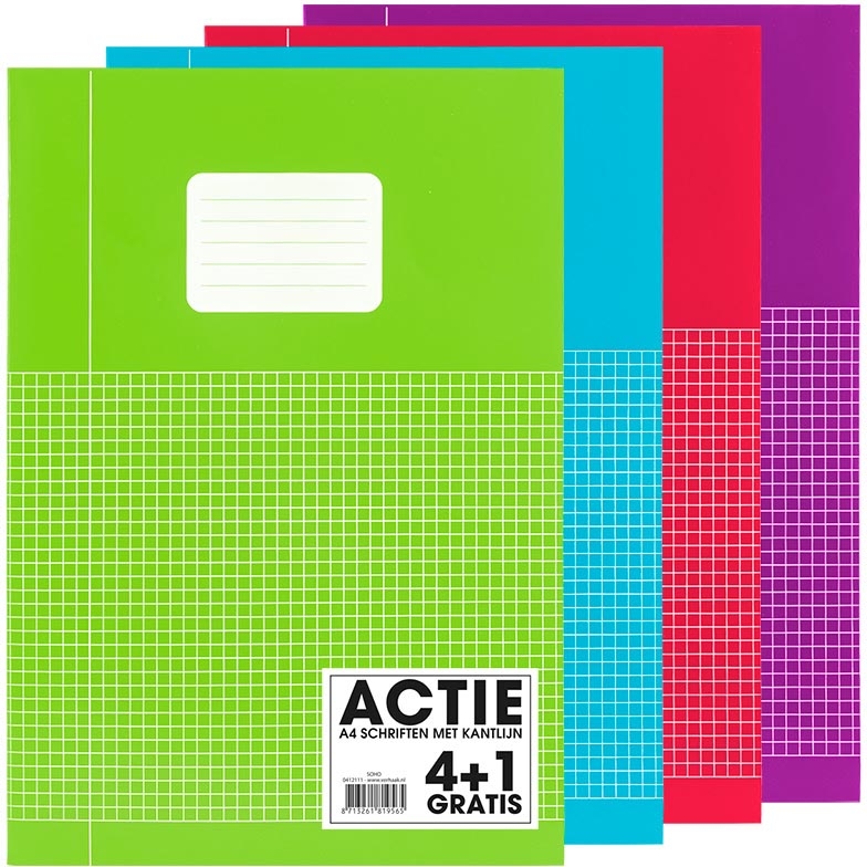 SOHO Trend schrift, A4, 40 vel, geruit 5 mm, met kantlijn, pak van 4 + 1 stuks, geassorteerde kleuren