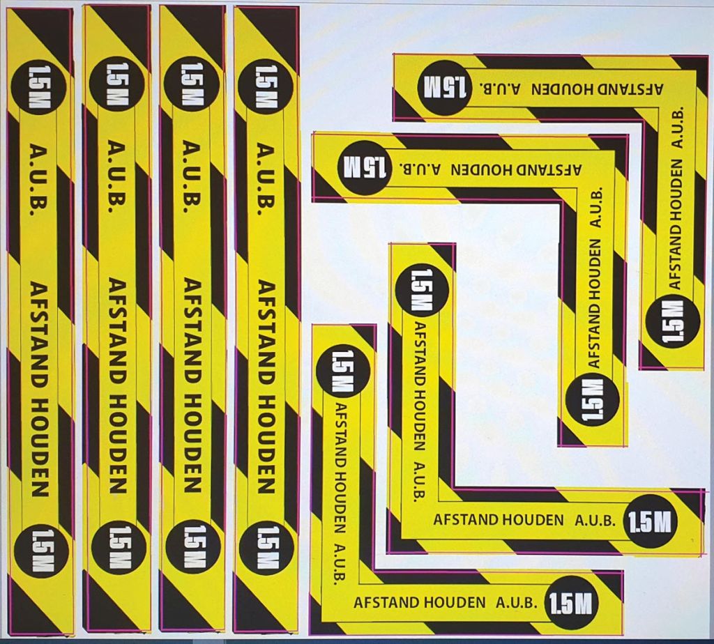 - Elke sticker bevat de mededeling "1,5 m afstand houden a.u.b."