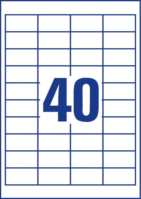 - Specificaties: Quickpeel: eenvoudig etiketten verwijderen van het blad Voor kopieermachines, laser- en inkjetprinters Met rechte hoeken Ft 21 x 29,7 cm (A4) FSC-gecertificeerd ft 48,5 x 25,4 mm, 4.000 stuks, 40 per vel, doos van 100 vel