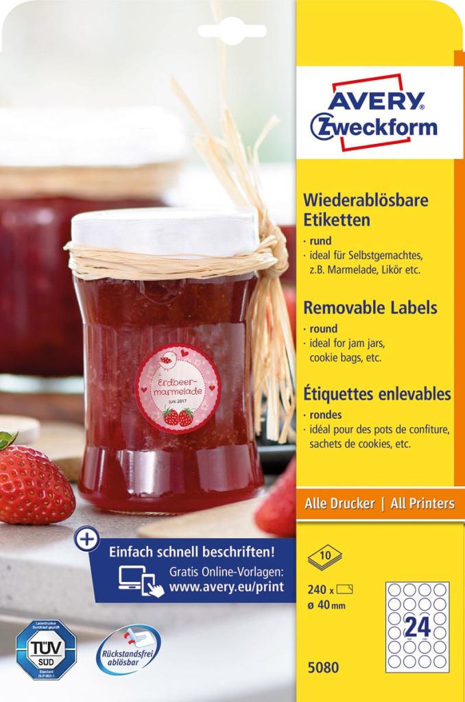 Avery Zweckform étiquettes rondes, diametre 40 mm, blanc, amovible, 240 étiquettes, 10 feuilles