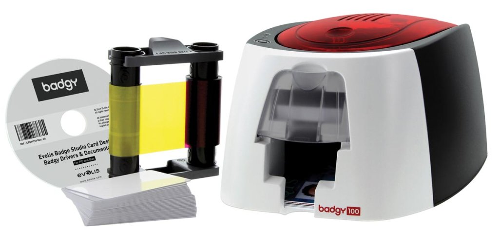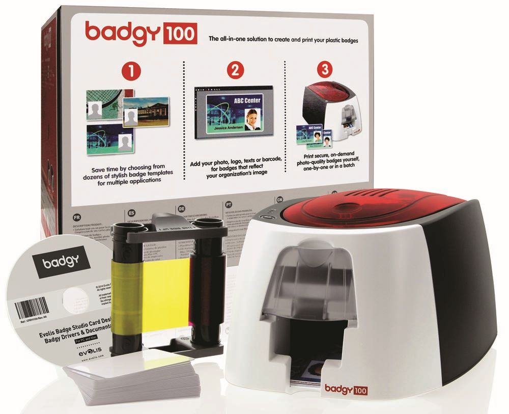 - BD212PR et BD224PR Le paquet Badgy100 se compose de : une imprimante de cartes plastique Badgy100 50 cartes pvc blanches vierges un ruban couleur 50 impressions une carte de nettoyage logiciel Evolis Badge Studio dans sa version standard une bibliothèque de modèles debadges personnalisables à télécharger gratuitement