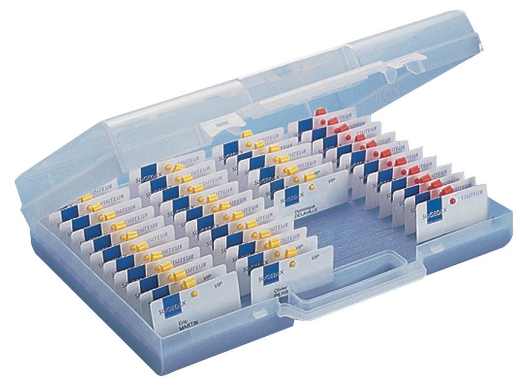 - Valisette pour le rangement de 86 badges format carte de crédit (86 x 54 mm) et/ou badges conférence (quantité selon format) en polypropylène avec mousse compacte et couvercle translucide