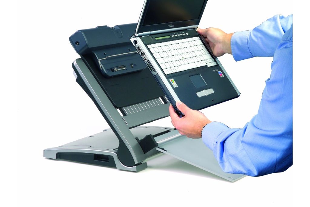 - Solution complète: réglable en hauteur (hauteur derrière : 9-26 cm), porte-documents intégré (breveté), plateau tournant, guidage des câbles, fentes de ventillation, mécanisme de sécurité pour support, portable et périphériques avec un seul câble de sécurité