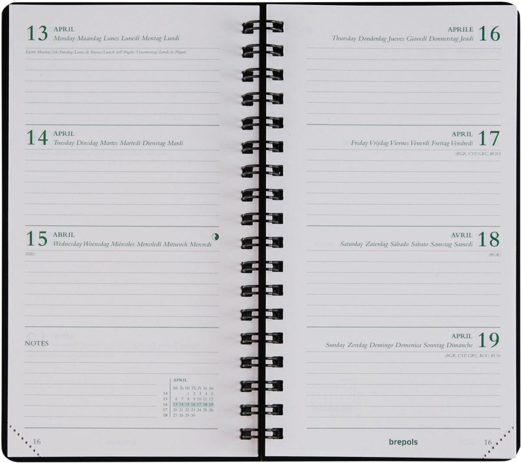 - 1 semaine sur 2 pages 6 langues Papier écologique blanc de 80 g/m² Avec ruban marque-page et coins détachables Ft 90 x 160 mm à reliure spirale, couleurs assorties: bleu et brun La sélection des couleurs n'est pas possible