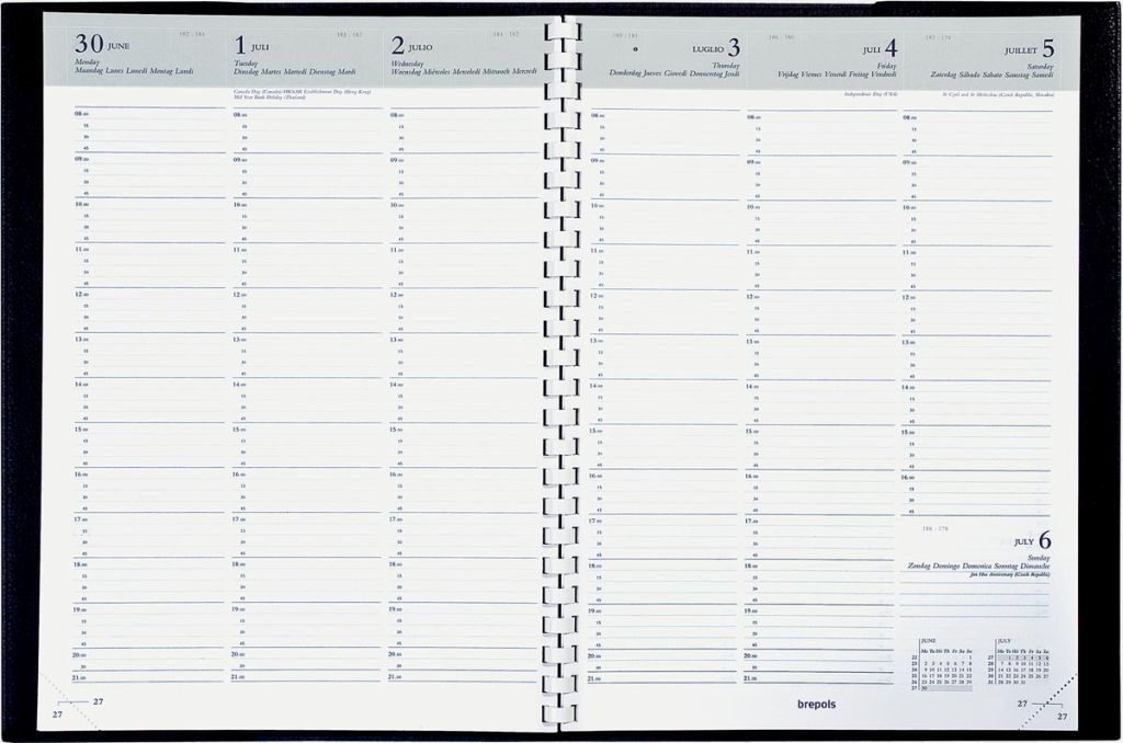 - 1 semaine sur 2 pages Par 1/4 heure (8h - 21h) 6 langues A reliure spirale Papier blanc sans bois de 70 g/m² 128 pages Avec coins détachables Couverture en similicuir avec grain nappa Ft 207 x 290 mm recharge