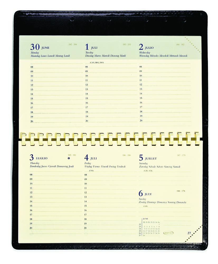 - 1 semaine sur 2 pages Par heure (8h - 20h) 6 langues A reliure spirale Mise en page horizontale Papier crème de 60 g/m² Avec coins détachables Ft 89 x 160 mm Genova, couverture en PVC finement grainé, noir
