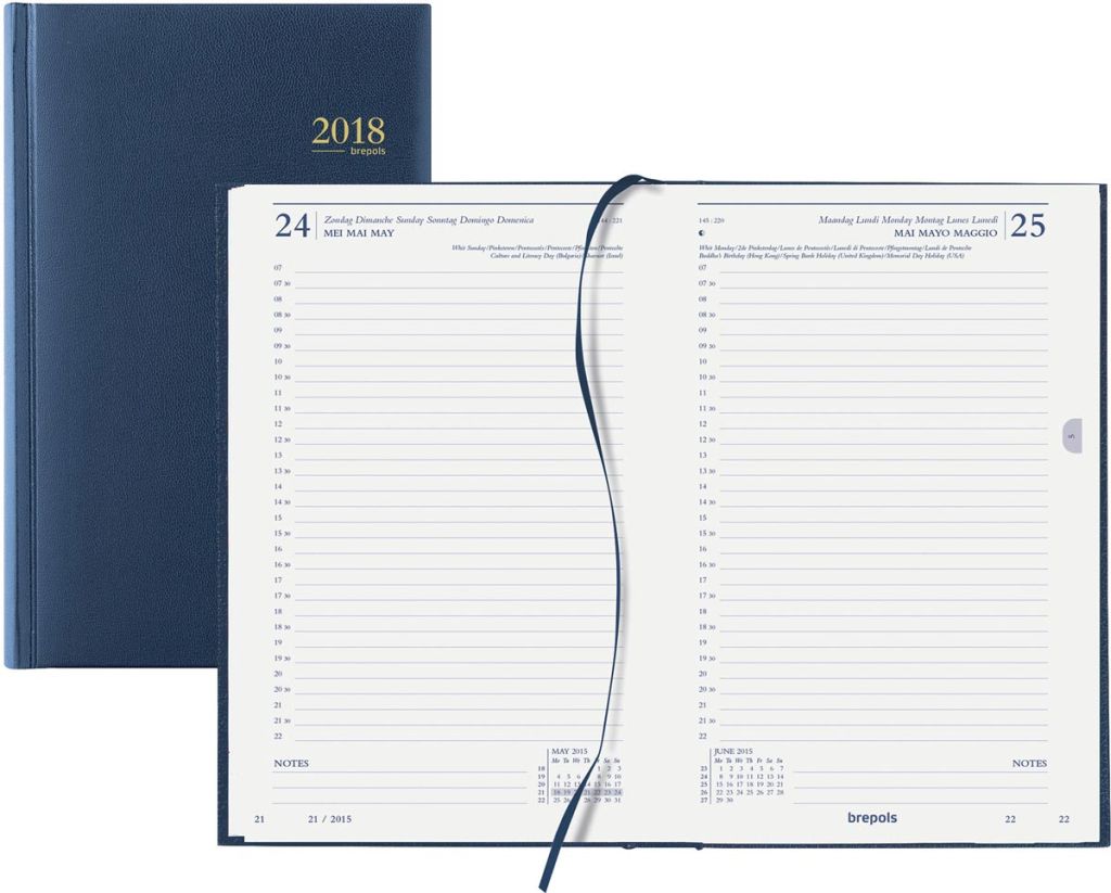 - 1 jour par page Par 1/2 heure (7h - 22h) 4 langues Relié Papier blanc sans bois de 70 g/m² 384 pages Avec ruban marque-page, coins détachables et onglets imprimés Couverture en similicuir uni Ft 133 x 208 mm Certificat: FSC Mixte Lima, couverture en similicuir uni, bleu
