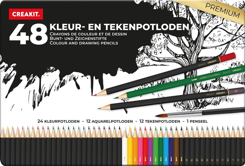 Creakit kleur- en tekenpotloden Premium, metalen doos van 48 stuks in geassorteerde kleuren en 1 penseel