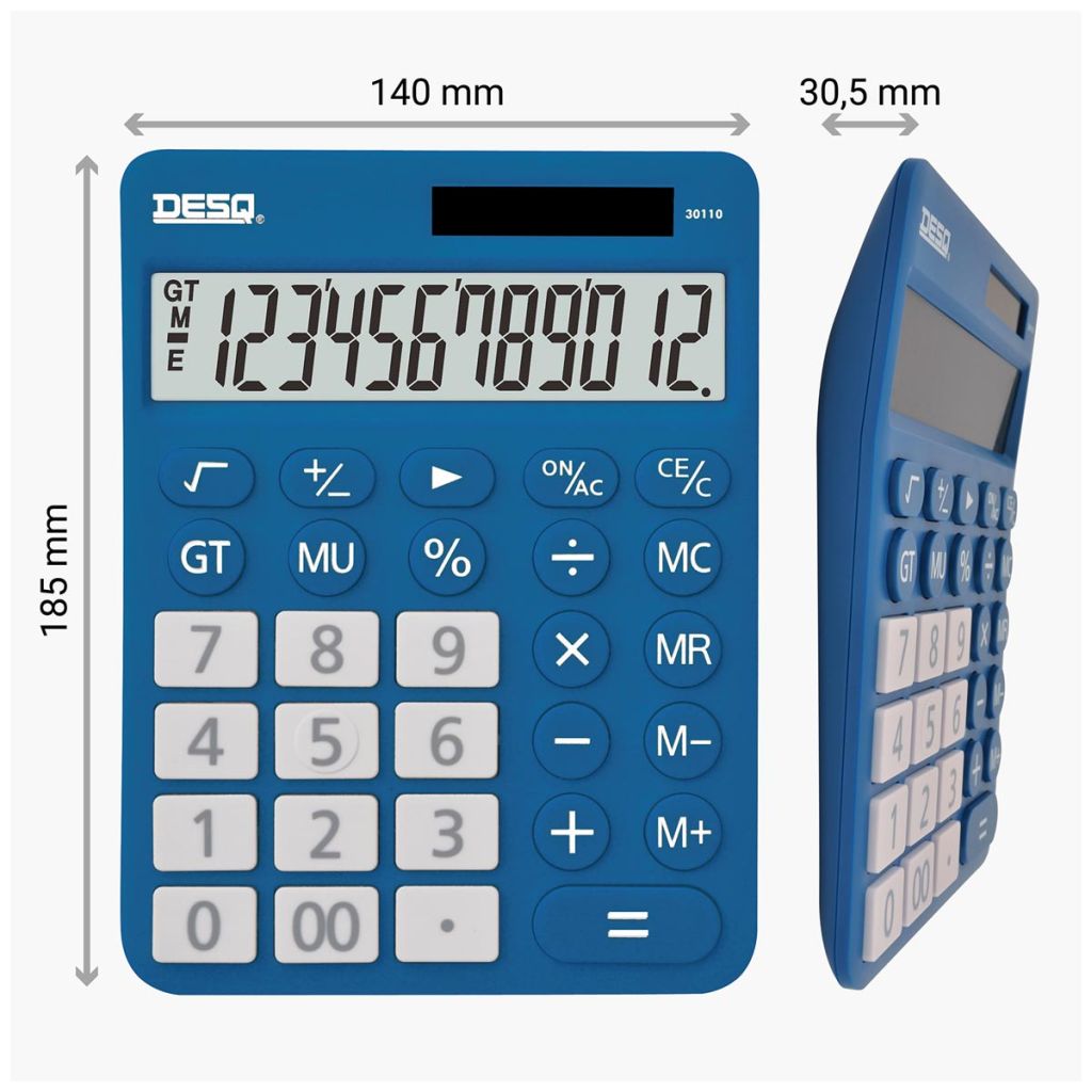 - Nombre de chiffres: 12 Touche % Touche changement de signe (+/-) Racine carrée Fonction GT Ft 3,05 x 14 x 18,5 cm (h x l x p) Fonctionne sur 1 pile AAA (incluse) Design en 2 couleurs bleu foncé