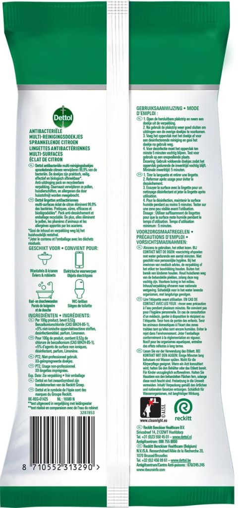- Lingettes multi-nettoyantes qui éliminent 99,9 % des bactéries