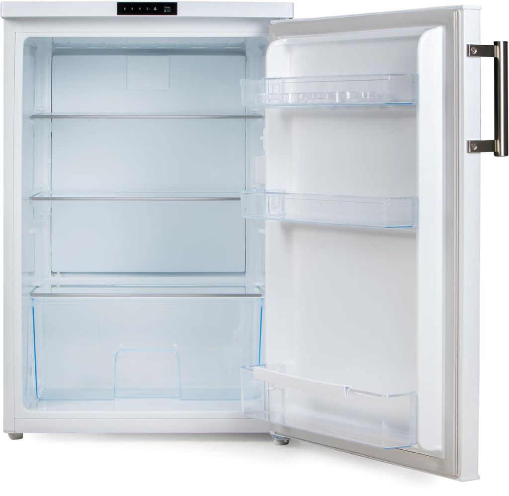 - Capacité: 134 l Porte réversible avec joint magnétique Affichage LED externe avec contrôle électronique de la température Fonction de super refroidissement Comprend 3 étagères en verre, un tiroir à légumes, 3 étagères de porte et un éclairage à LED Poignée élégante en acier inoxydable Niveau sonore: 38 dB Ft 55,5 x 63 x 84,5 cm Couleur: blanc Classe énergétique: D