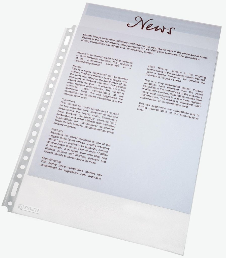 - Pochettes avec finition mate transparente, idéales pour une utilisation quotidienne à la maison, au bureau ou à l'école, avec une bande renforcée perforée à 11 trous permettant de ranger facilement les documents dans des classeurs tout en les protégeant del'humidité, de la poussière et de la saleté, une ouverture par le haut offrant un accès rapide sans ouvrir le mécanisme, fabriquées en polypropylène (PP) contenant 30 % de plastique recyclé pré-consommation, sans acide, compatibles avec les photocopies etentièrement recyclables pour une protection durable des documents