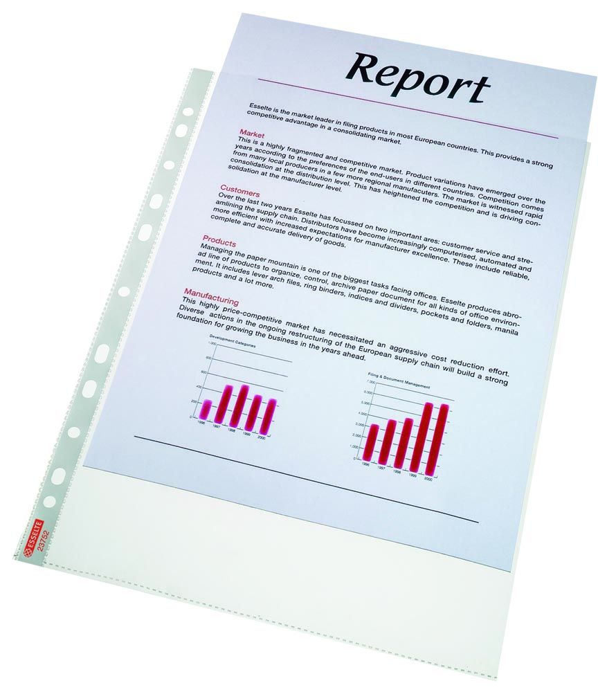 - Pochettes avec finition mate transparente, idéales pour une utilisation quotidienne à la maison, au bureau ou à l'école, avec une bande renforcée perforée à 11 trous permettant de ranger facilement les documents dans des classeurs tout en les protégeant del'humidité, de la poussière et de la saleté, une ouverture par le haut offrant un accès rapide sans ouvrir le mécanisme, fabriquées en polypropylène (PP) contenant 30 % de plastique recyclé pré-consommation, sans acide, compatibles avec les photocopies etentièrement recyclables pour une protection durable des documents