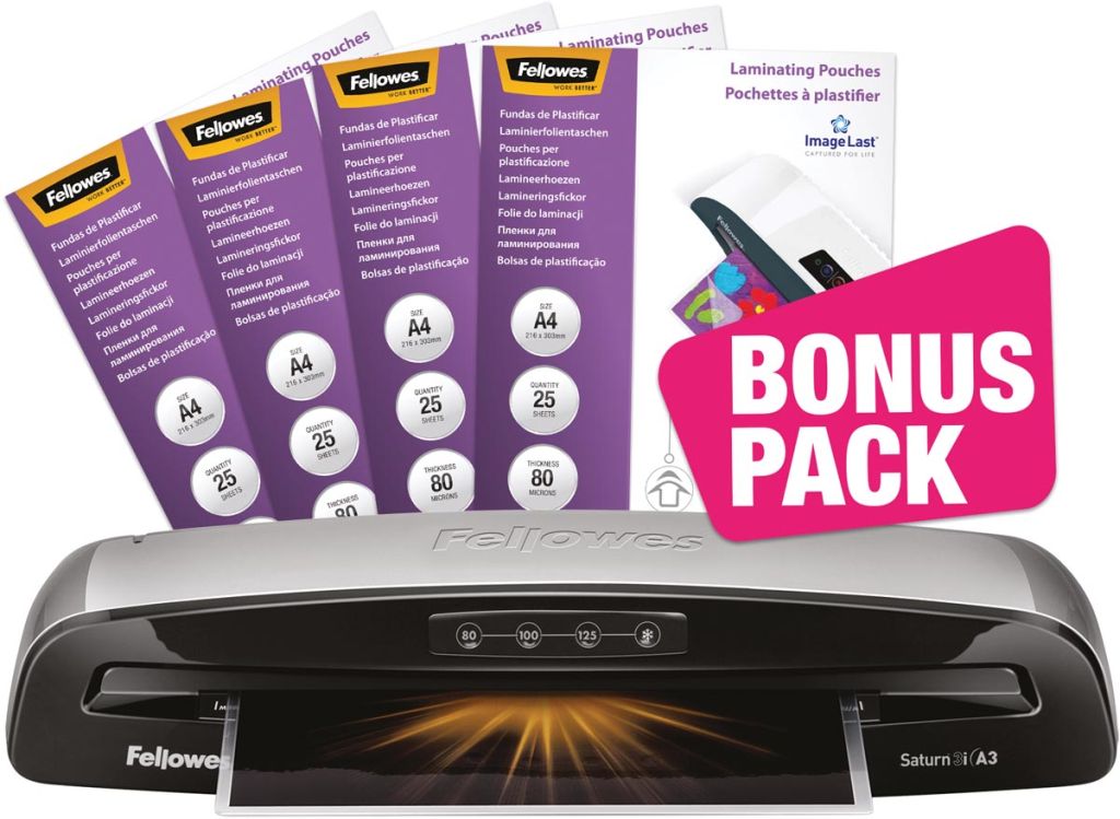 Fellowes machine à plastifier Saturn pour ft A3 + Bonus Pack de 100 pochettes (ft A4, 80 microns)