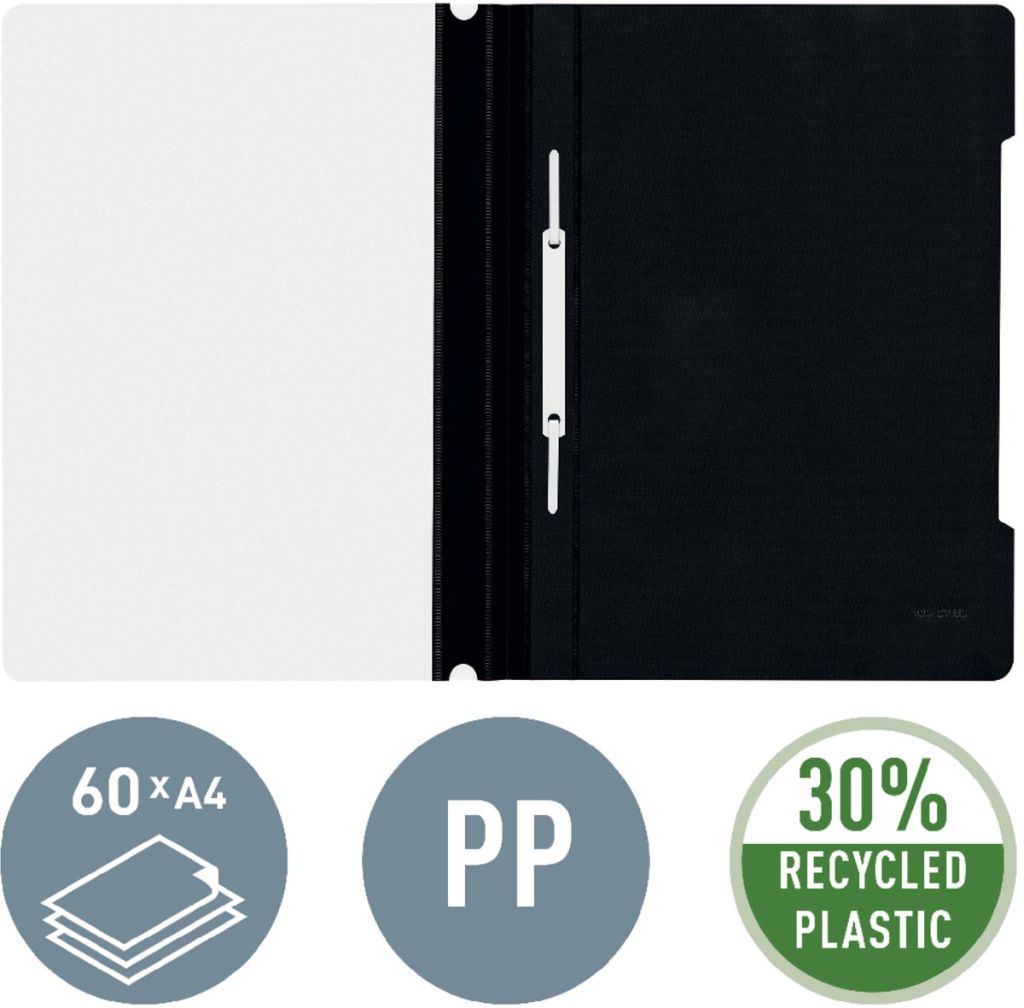 - Verso coloré, recto transparent Bande de titre sur toute la longueur avec découpe en haut et en bas pour un retrait facile Encoche au dos pour faciliter l'ouverture Étiquette uniquement - pas de déchets d'emballage supplémentaires noir, capacité: 60 x A4 (papier 80 g/m²)