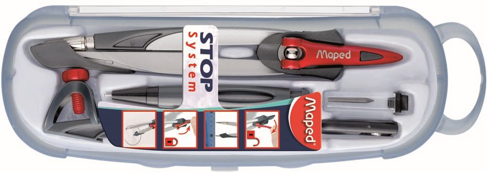 - coffret 5 pièces, en boîte brochable: 1 compas Stop System, 1 bague universelle, 1 taille-mines, 1 étui-mines et 1 porte-mines 0,5 mm