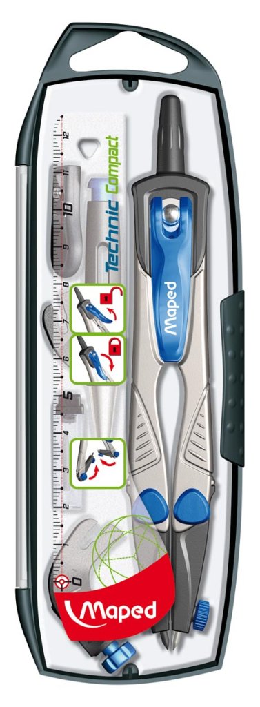 - coffret 5 pièces: 1 compas Technic Compact, 1 bague universelle, 1 étui-mines, 1 taille-mines et 1 porte-mines 0,5 mm