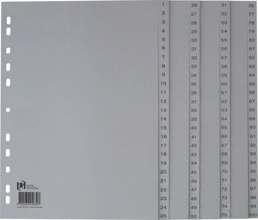 Oxford intercalaires, A4, en PP, 11 trous, 100 onglets numérotés, gris