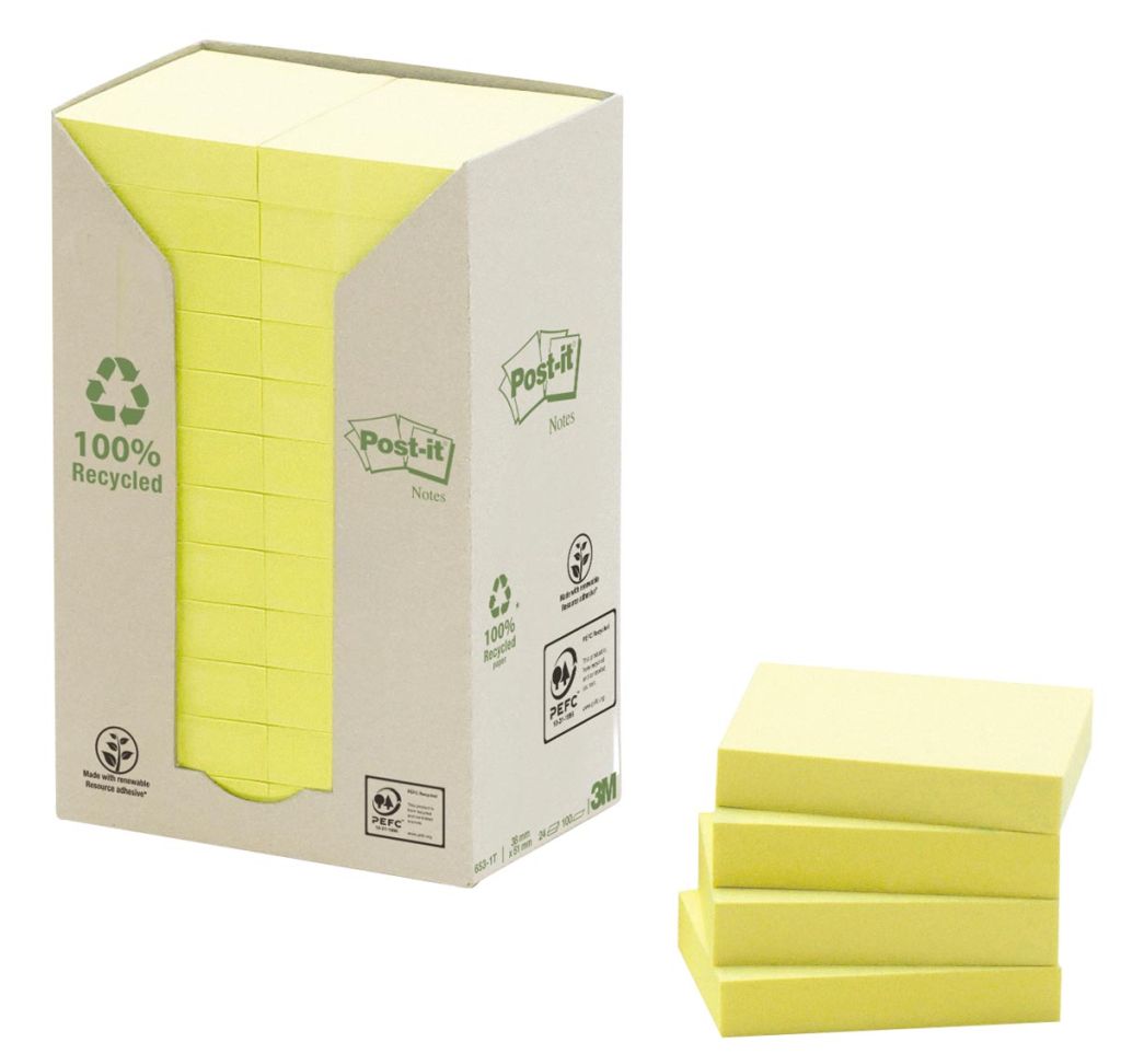 Post-it Recycled Tower Pack Jaune ft 38 x 51 mm, 24 pièces