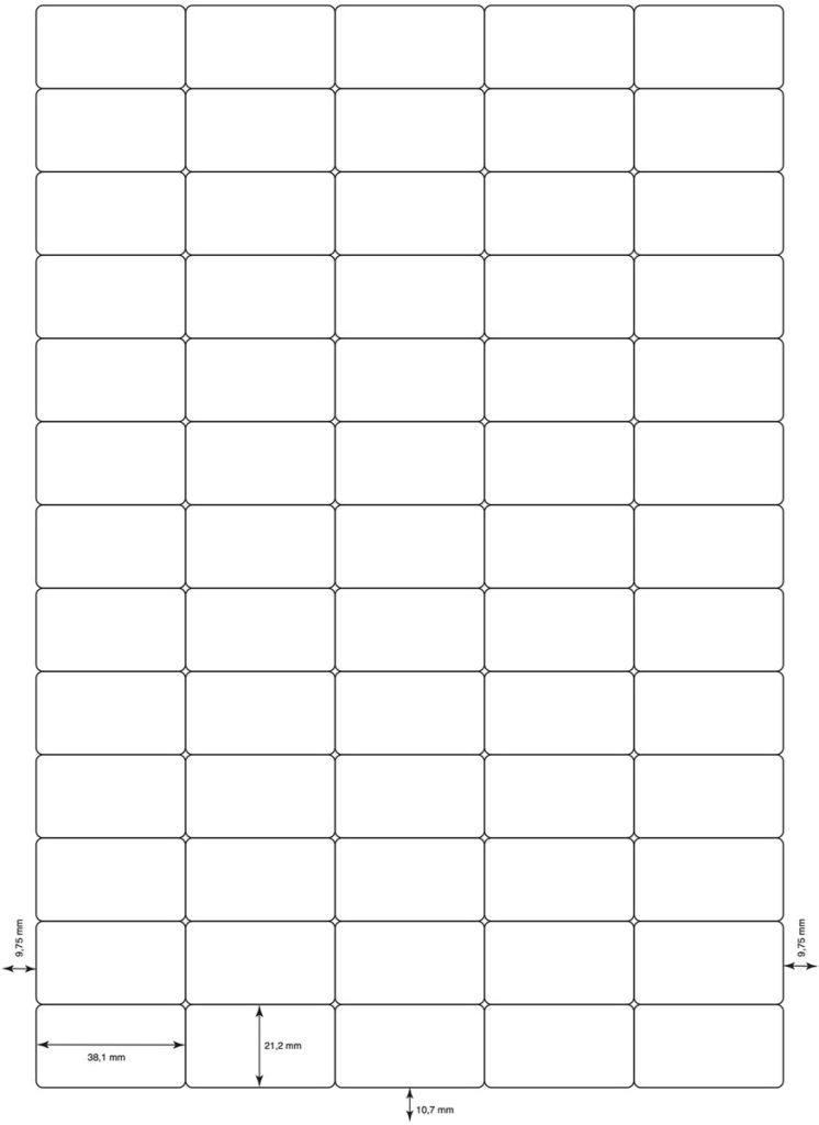 - ft 38,1 x 21,2 mm, coins arrondis, 100 feuilles, 65 étiquettes par feuille, 6.500 étiquettes