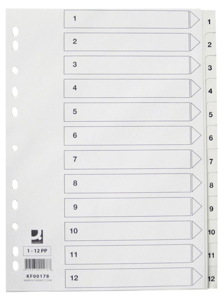 Q-CONNECT intercalaires, A4, PP, 11 trous, avec page de garde, jeu de 1-12, blanc
