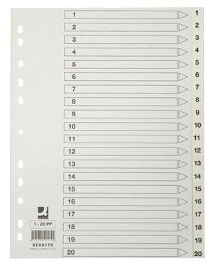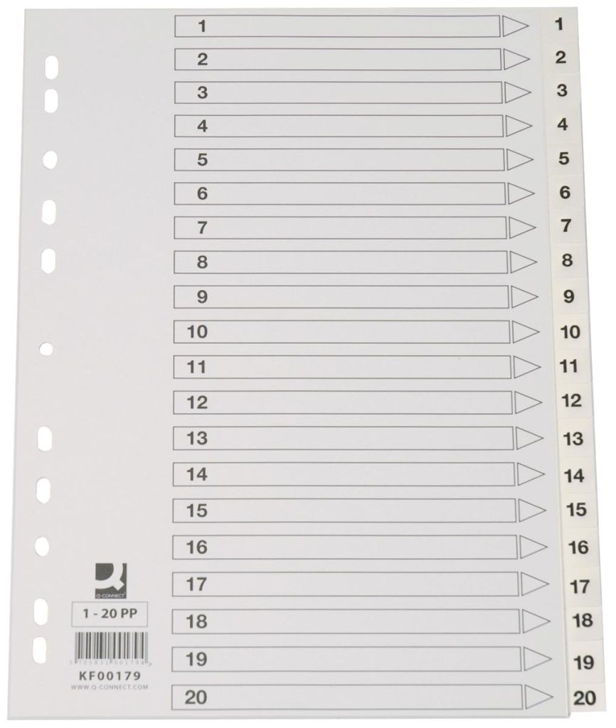 Q-CONNECT intercalaires, A4, PP, 11 trous, avec page de garde, jeu de 1-20, blanc