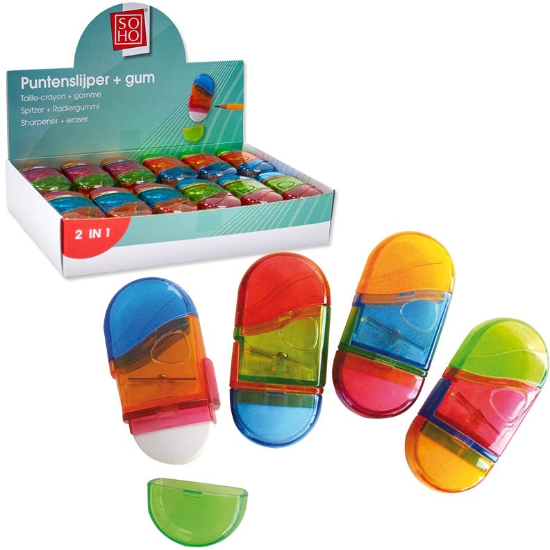 - Gomme et taille-crayon en un seul Couleurs assorties
