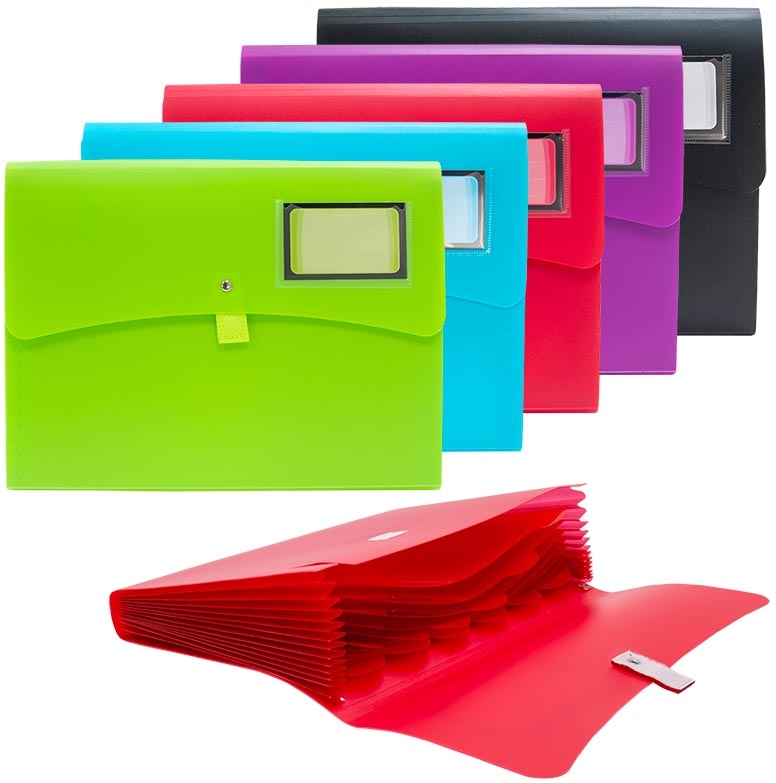 - Pour ft A4 En PP opaque Avec 12 compartiments Fermeture à auto-agrippante Avec pochette pour étiquette Couleurs assorties: rouge, pourpre, vert, bleu clair et noir