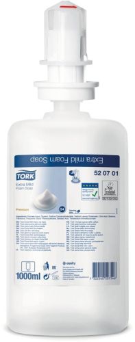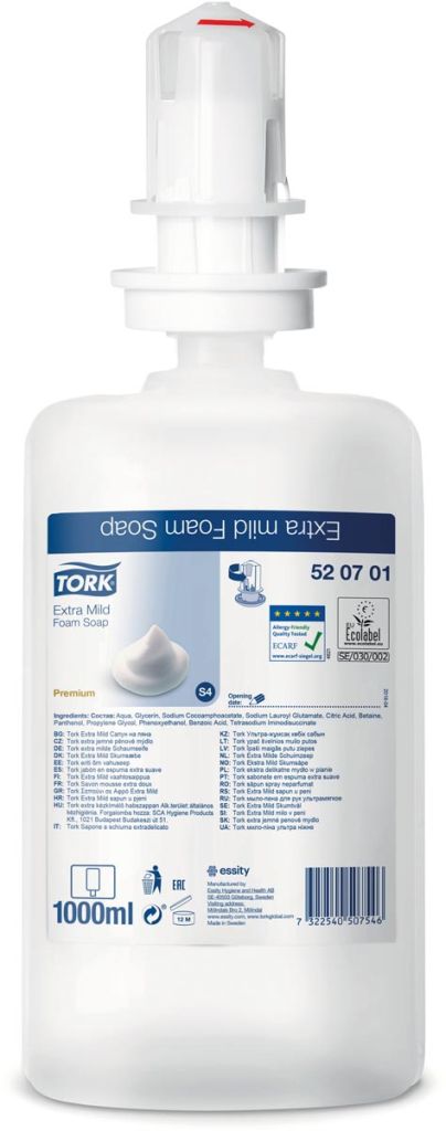- Système: S4 Convient aux distributeurs de savon liquide et en spray de Tork Soins supplémentaires pour les peaux sensibles Contient des ingrédients doux et est exempt de parfum et de colorants Certifié par l'ECARF (European Centre for Allergy ResearchFoundation) comme étant sans danger pour les allergies Testé dermatologiquement Facile à recharger La bouteille fait le vide, ce qui réduit le volume des déchets de 70 % Bouteille de 1 l Certificat: EU Ecolabel