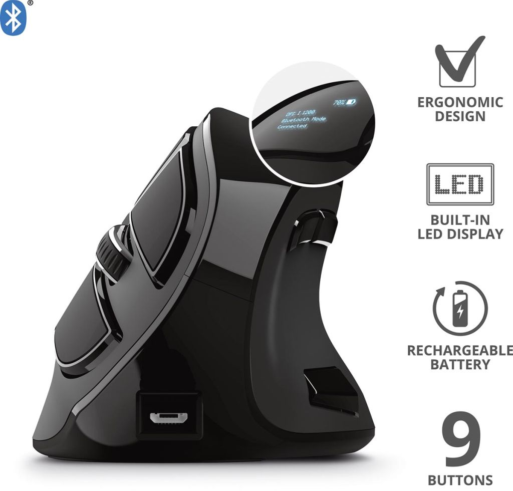 - Une prise verticale qui assure une position neutre et détendue de la main et du poignet Connectivité sans fil adaptable (avec microrécepteur USB logeable dans la souris, Bluetooth) Pour droitiers Avec 9 boutons Sensibilité réglable (1200 - 2400 dpi) Portée sans fil de 10 m Fonctionne sur batterie interne, chargeable via porte USB micro Affichage LED indiquant l'état de la batterie et de la connexion, le mode sans fil et le réglage de la connexion Couleur: noir