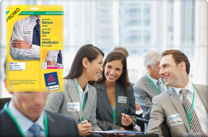 Met een eenvoudige zelfklevende badge is het heel eenvoudig (en overigens ook heel aangenaam) om iedereen een naambadge te bezorgen. Deze naambadges kleven heel stevig en zijn makkelijk verwijderbaar zonder daarbij de kledij te beschadigen. De badges kunnen geprint worden vanaf een laserprinter en hebben het formaat: 63,5 mm op 29,6 mm. |