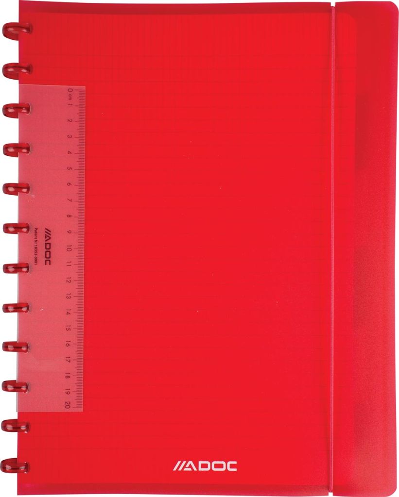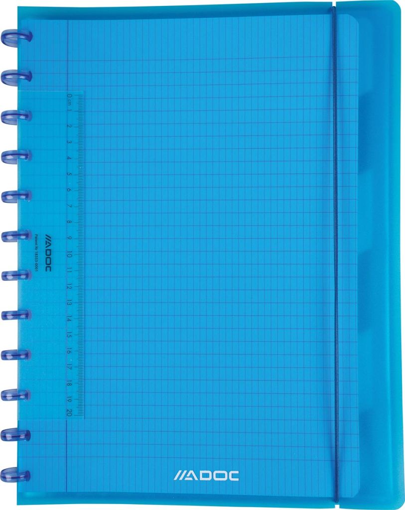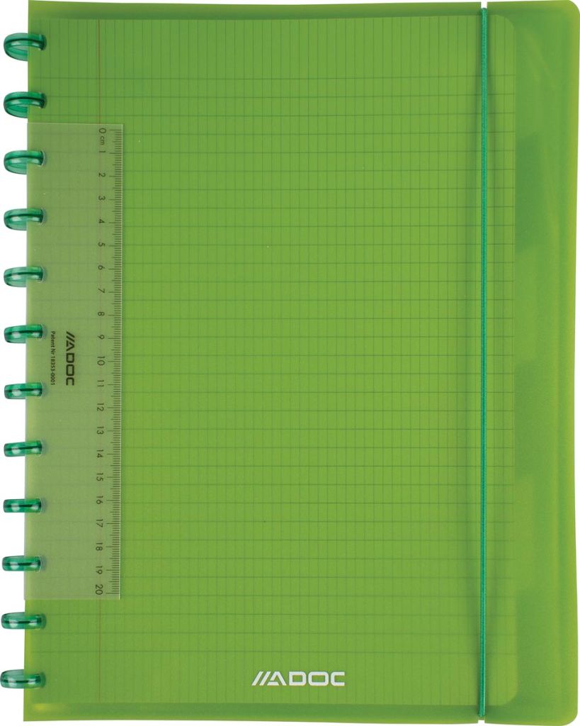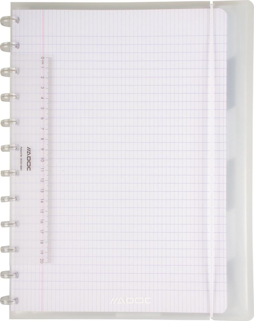- Papier van 90 g/m² met tabbladen, rode kantlijn, meetlat en elastiek
