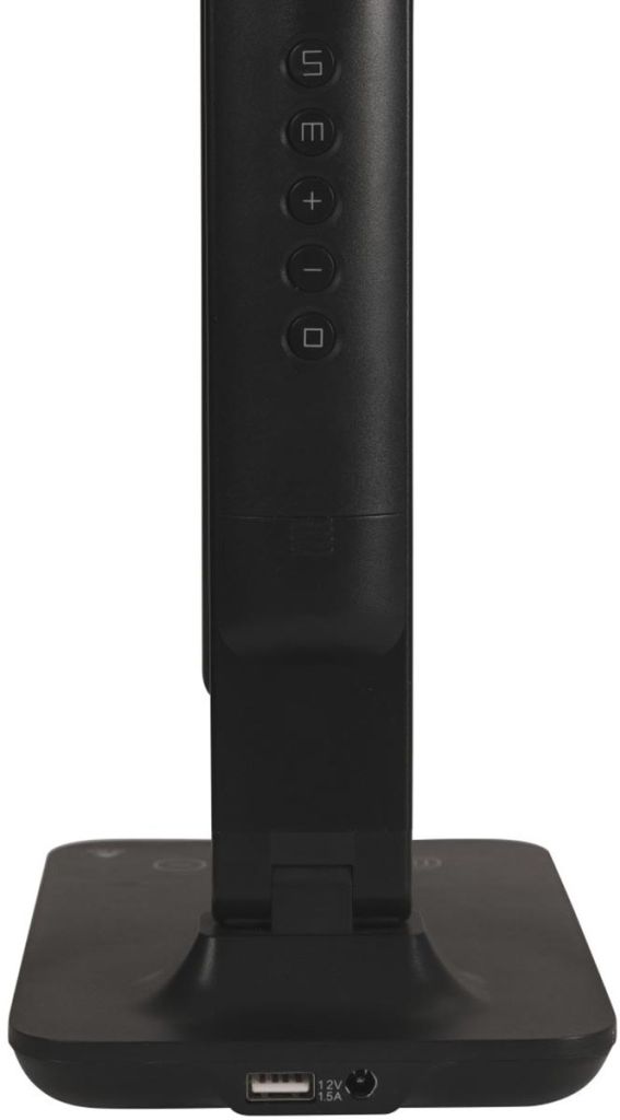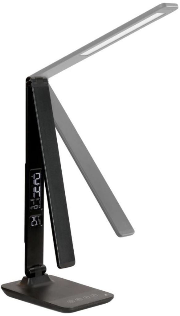 - Type lamp: LED 10 W Levensduur: 25 000 uur Helderheid: 500 lumen Temperatuur licht: 2800 - 6500 Kelvin Sokkel: 19 x 12 cm Armlengte: 36 cm Lampenkap: 34 x 4 cm Met kabel Aan/uit knop op de voet Met geïntegreerd display (uur, datum, temperatuur) Met USB-poort om apparaten op te laden Energieklasse G (Spectrum A tot G) LED's kunnen niet vervangen worden Kleur: zwart